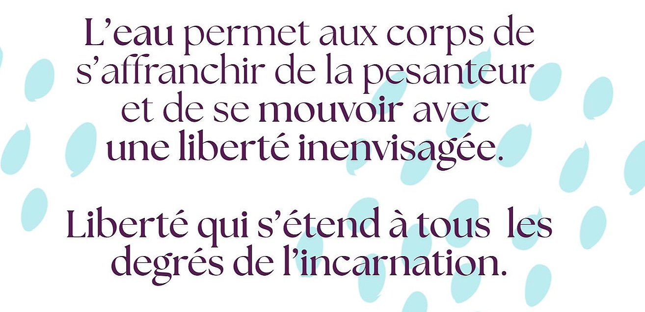 En interaction directe avec l’eau, le corps (composé lui-même à 99% de molécules aqueuses !) cherche naturellement à émuler sa fluidité, sa transparence, sa joie, sa puissance, son harmonie, à se laisser porter et à accepter de suivre son courant.